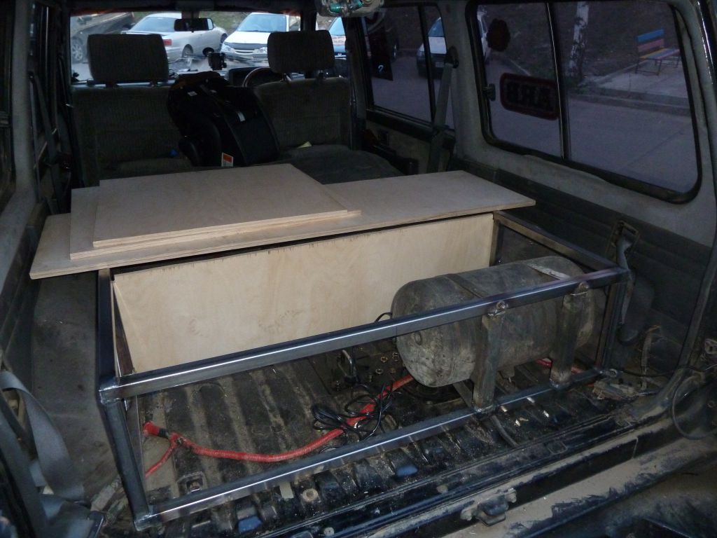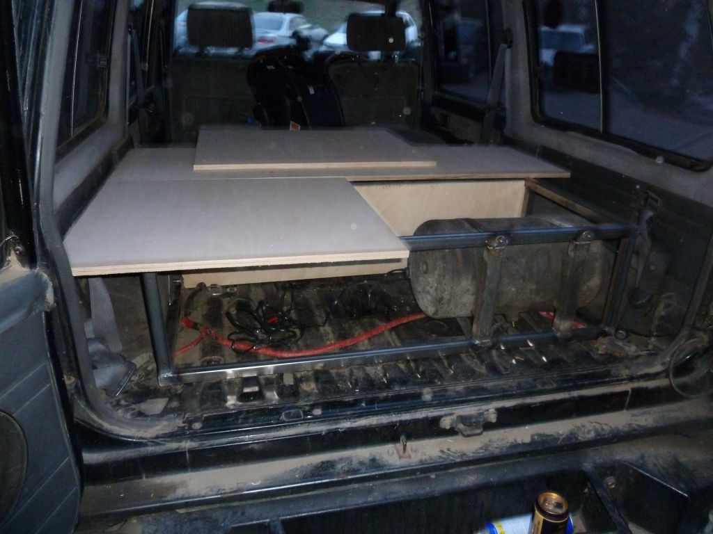 да болтами, рессивер стоит как надо, там же и компрессор будет. Вдоль багажника будут отсеки под НЗ и вещи, инструмент, по краям арок-такелаж