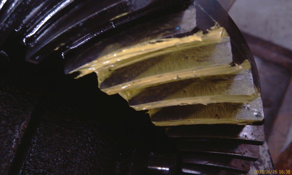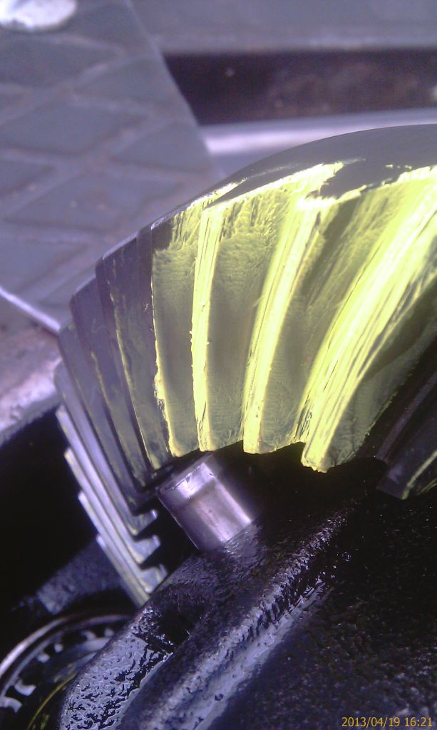 Взялся разбирать. Зазор в ГП в норме. Пятно контакта указывает на слишком глубокую установку пиньона. Ну и нет никакого люфта на хвостовике! Подшипники все в норме.
