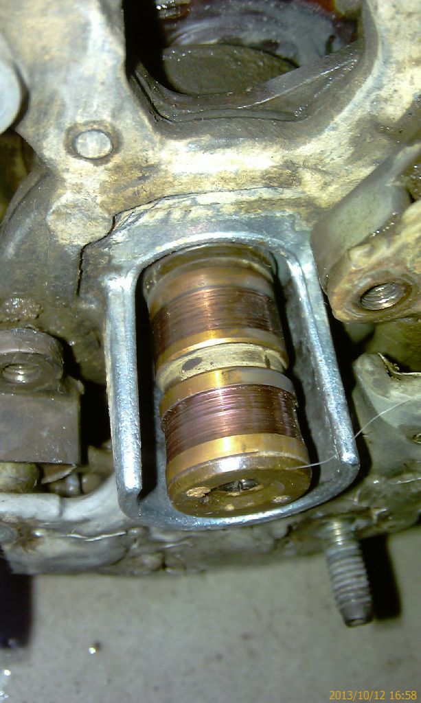 Щётки уже не хороши, щёточный узел без защитной резинки и забит пылью, от чего щётки ходят плоховато, внешнее кольцо коллектора стандартно съедено примерно на 0,5-1мм. Канавка на кольце стандартно протёрта не ровного профиля, а с одного края глубже(это обусловлено положением щёток в самом щёточном узле с определённого момента износа) Канавка почерневшая, что явно является последствиями плохого контакта.
