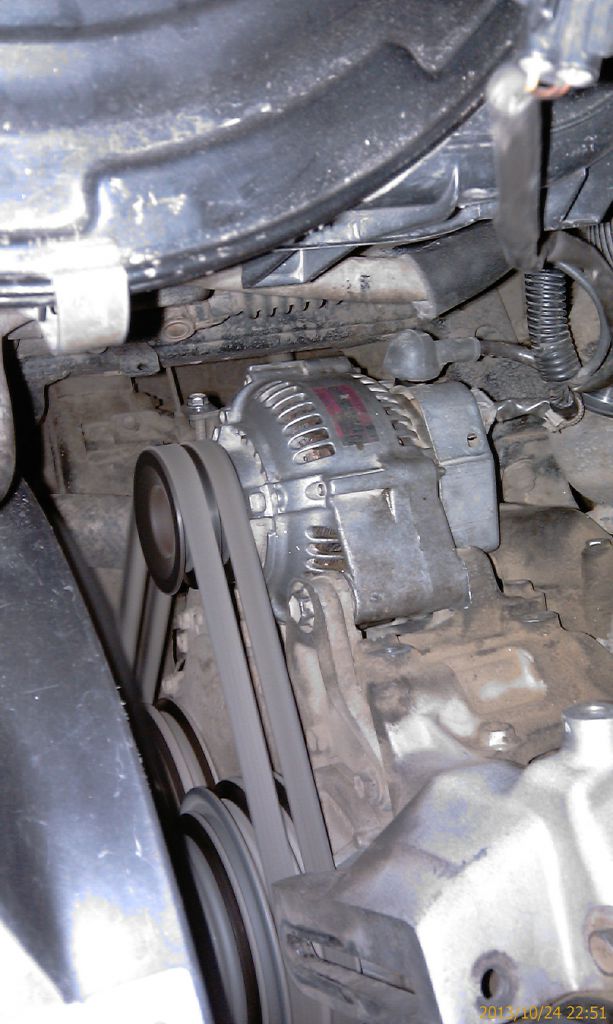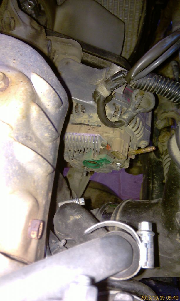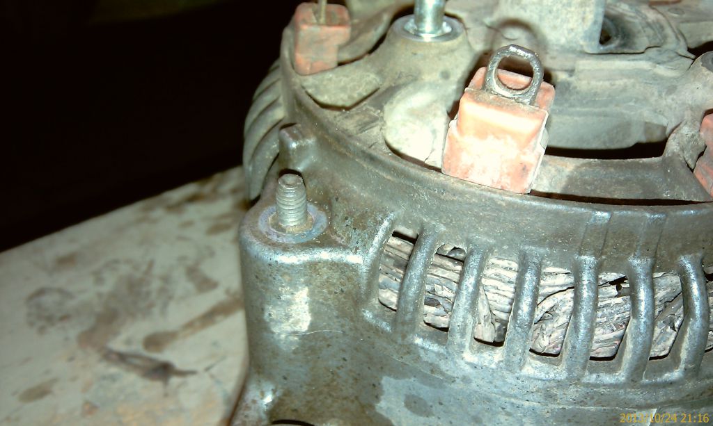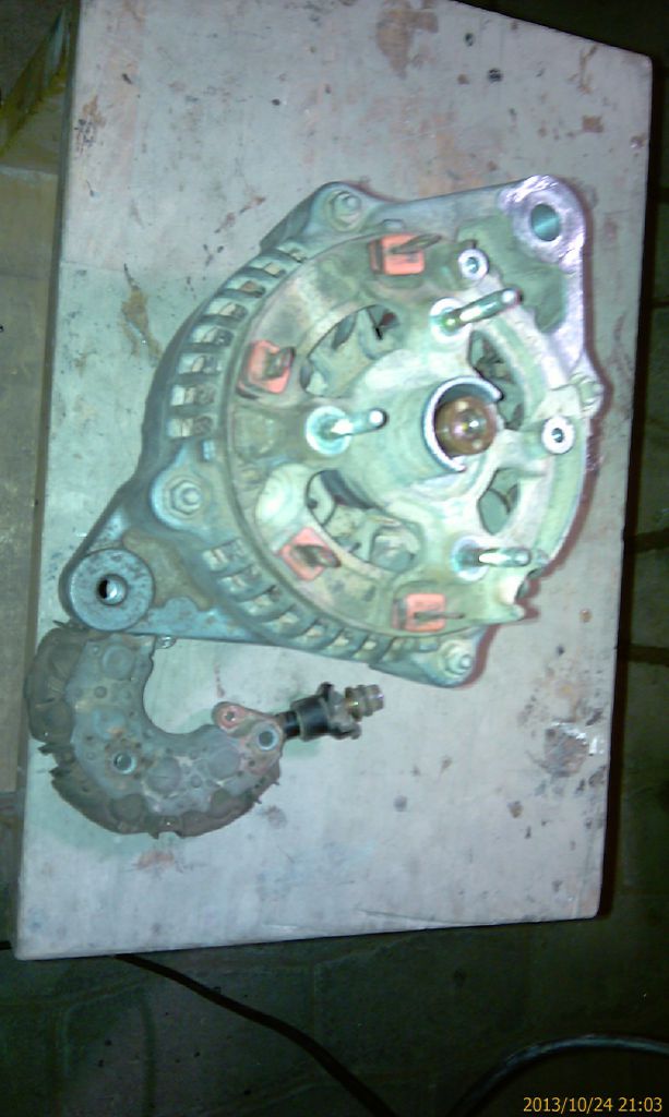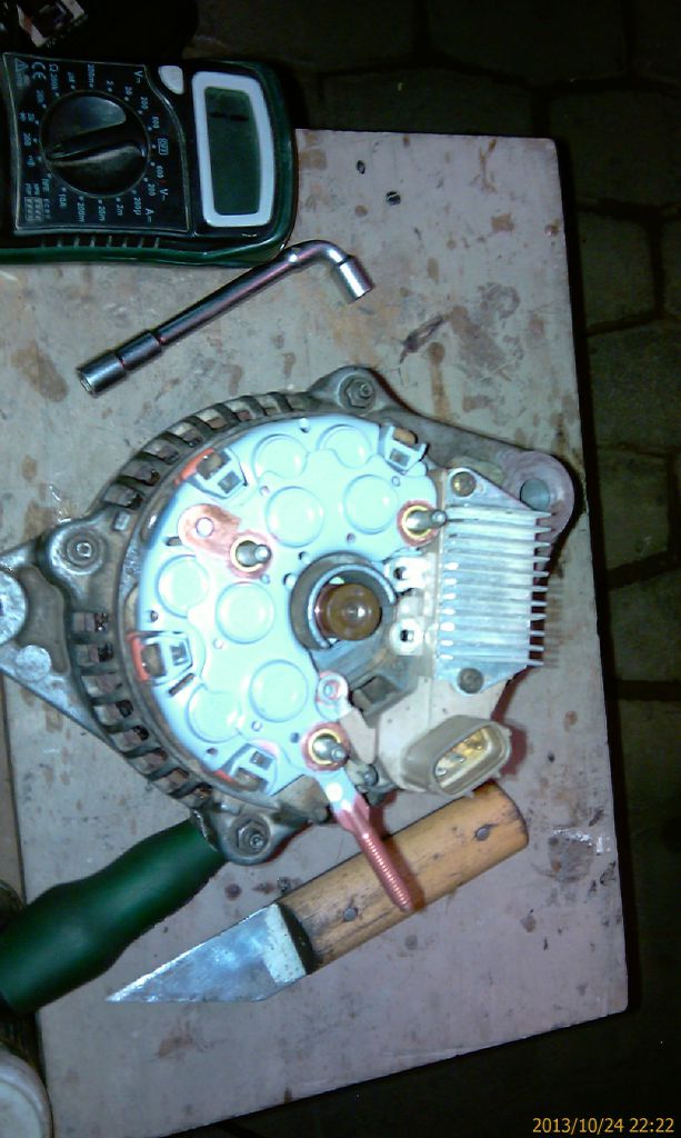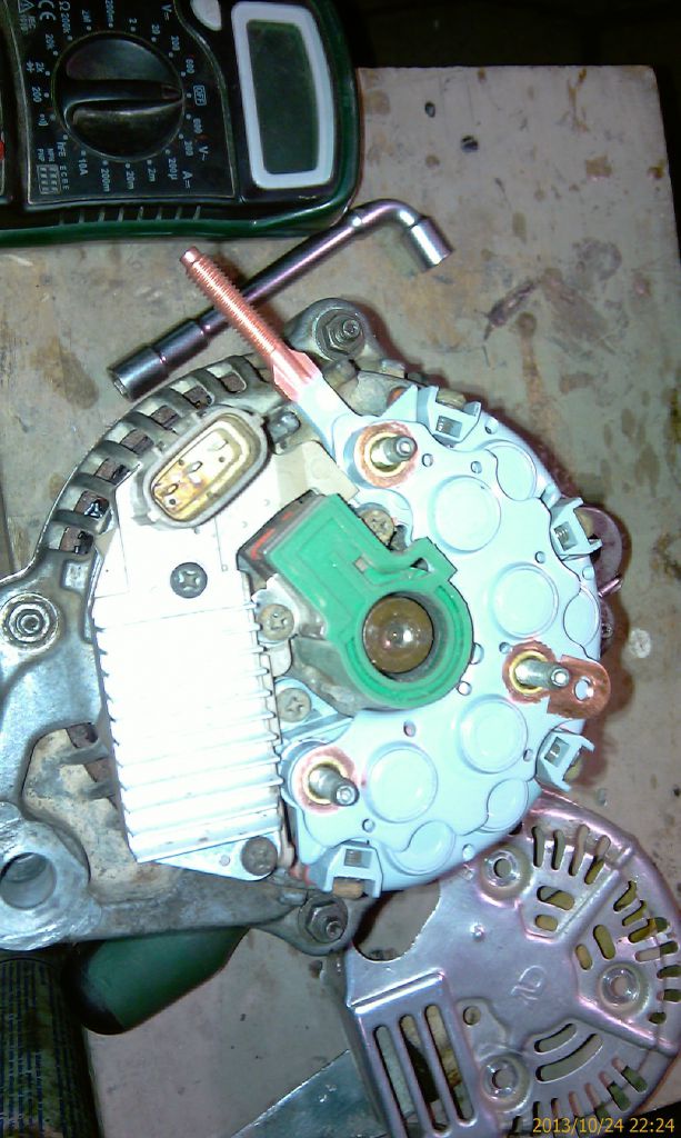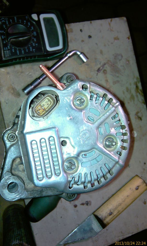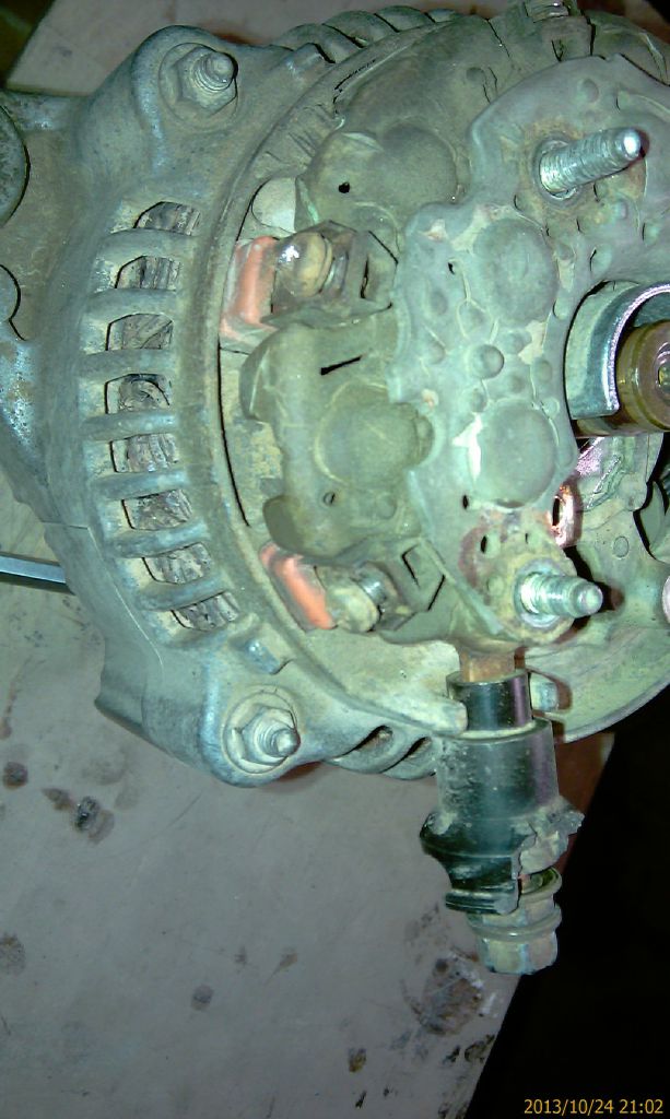 Вот неудачно то, на дворе вечер, завтра на работу, а на улице похолодало... :( А, была-ни была, еду в холодный гараж одевшись потеплее в надежде снять крышку не снимая генератора и, как минимум проверить щёточный узел и мост. Замер напряжения на аккумуляторе показывает 12,3В при неработающем моторе и 12,05В при запущенном :( И не тут то было, на Сурфе крышка с гены на месте не снимается, зато перекурив понимаю, что гена здесь снимется проще, чем у Алексея в описании и вот через полчаса он уже вскрыт :)