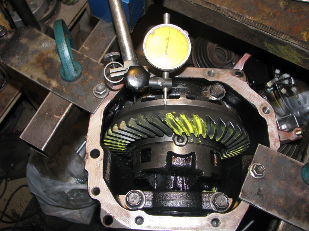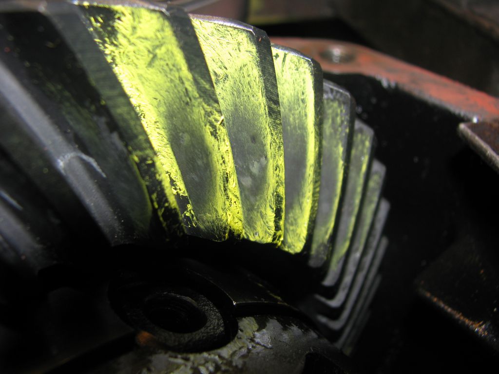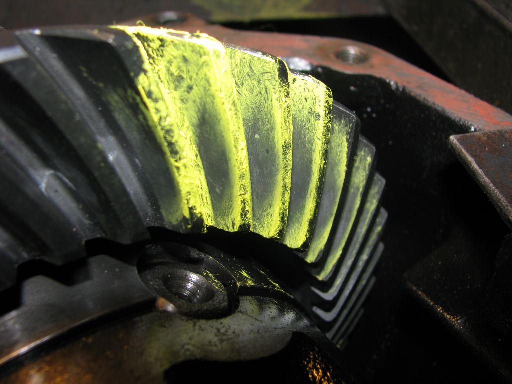 Со щупом 0,40 зазор в зацеплении около 0,20. Для проверок нормально. Можно прокатывать пятно. Очень надеюсь, что пятно покажет недогруженный пиньон, тогда я поменяю шайбу под подшипником на пиньоне и останется шанс, что старые шайбы подойдут. Но не тут то было. С первой же шайбой 2,00, снятой со штатной ГП, получаю идеальный отпечаток: