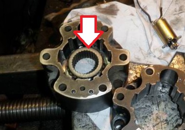 Несмотря на то, что втулка при правильной сборке крышки (см. предыдущую страницу) может оказаться только в двух положениях, сама втулка без пластины должна входить в корпус в любом из шести возможных положений. Возникшие трудности указывают лишь на то, что в ходе эксплуатации зубья втулки и корпуса набили себе удобное положение и в другом совокупляться уже не желают :pardon: