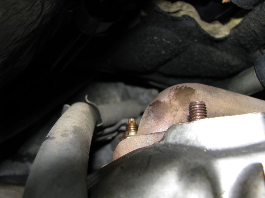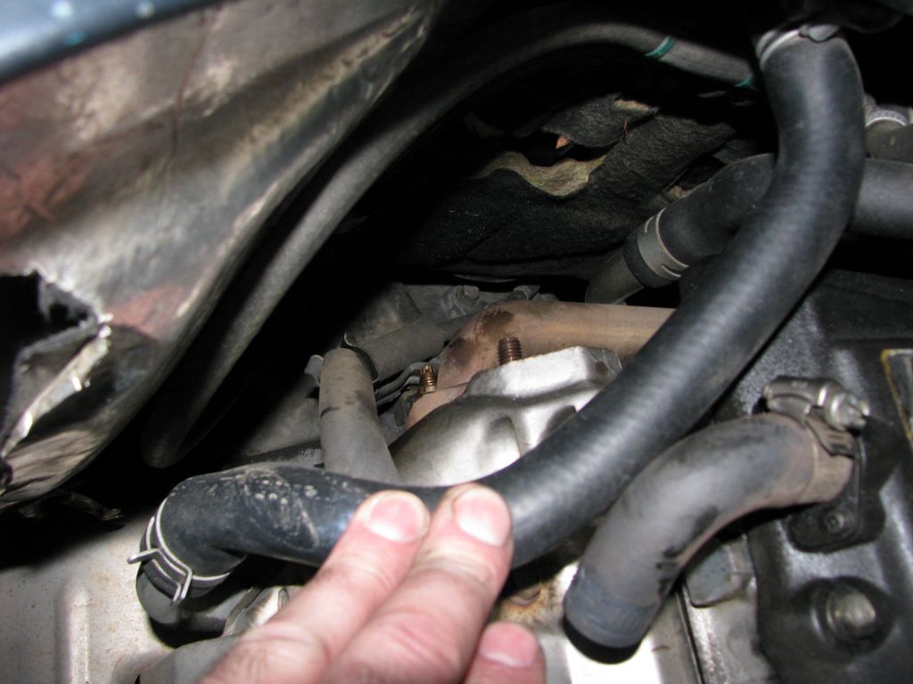 Нормально отвернулись и с коллектора. Но снять EGR не удалось: не снимается полностью со шпилек. Выкрутить шпильки на впуске пассатижами не удалось. Стронулась только одна. Труба EGR ровно посередине моторного щита упирается в вертикальную печкину трубку. В общем пришлось в муках крутить четвертую гайку на коллекторе. В результате она, естественно, упала и потерялась.