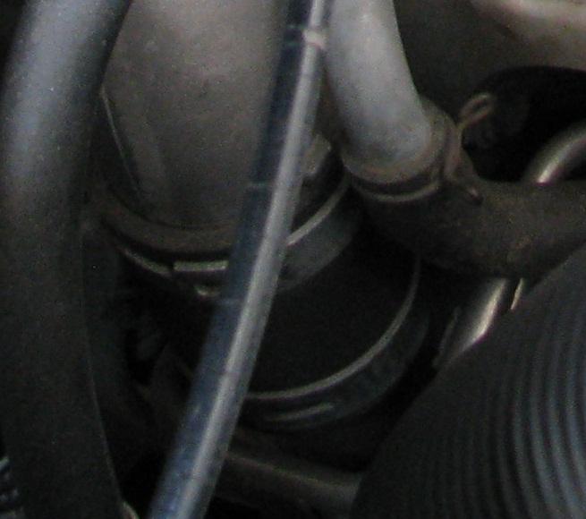 и снизу металлической трубы, закрепленной на всасывающей трубе с внутренней стороны, широкими пассатижами сжать и стянуть вниз хомут на входном патрубке всасывающей трубы