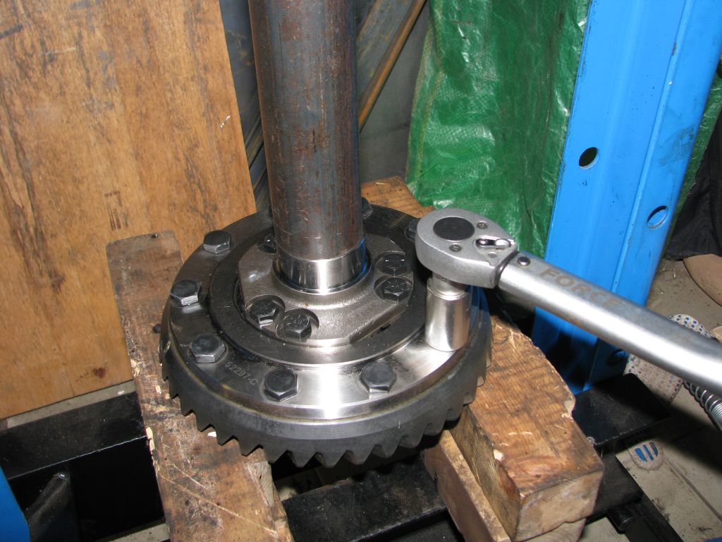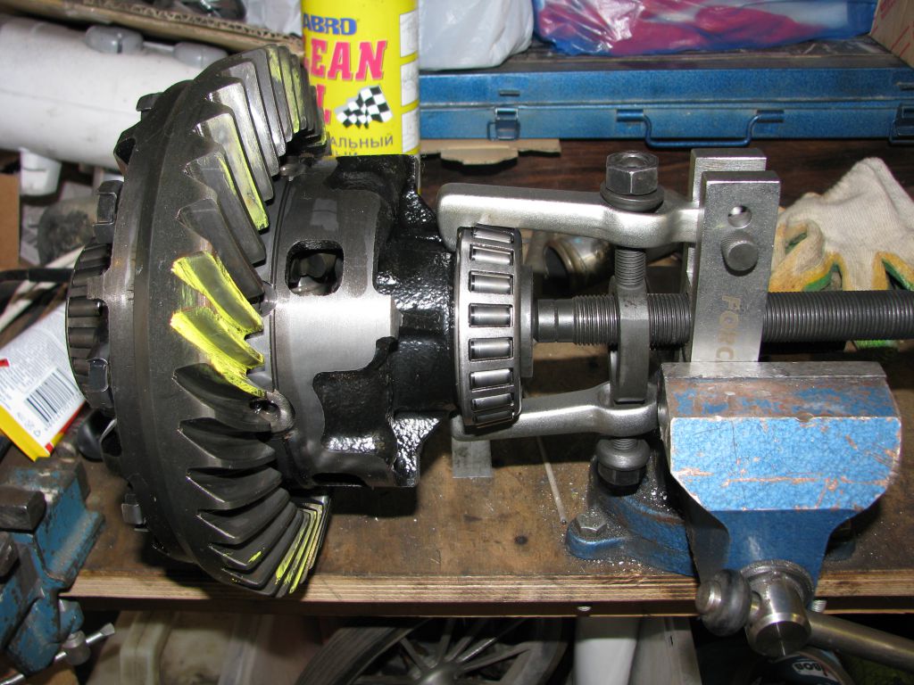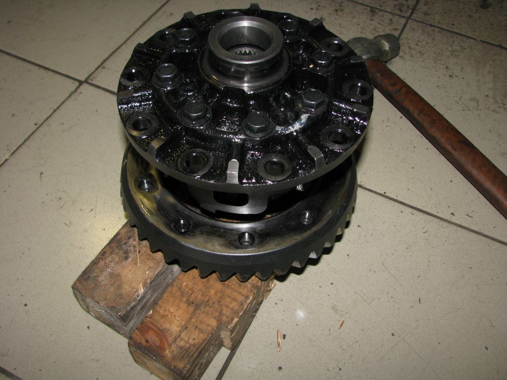 Отворачиваются болты крепления ведущей шестерни и она сбивается со штатного дифференциала: