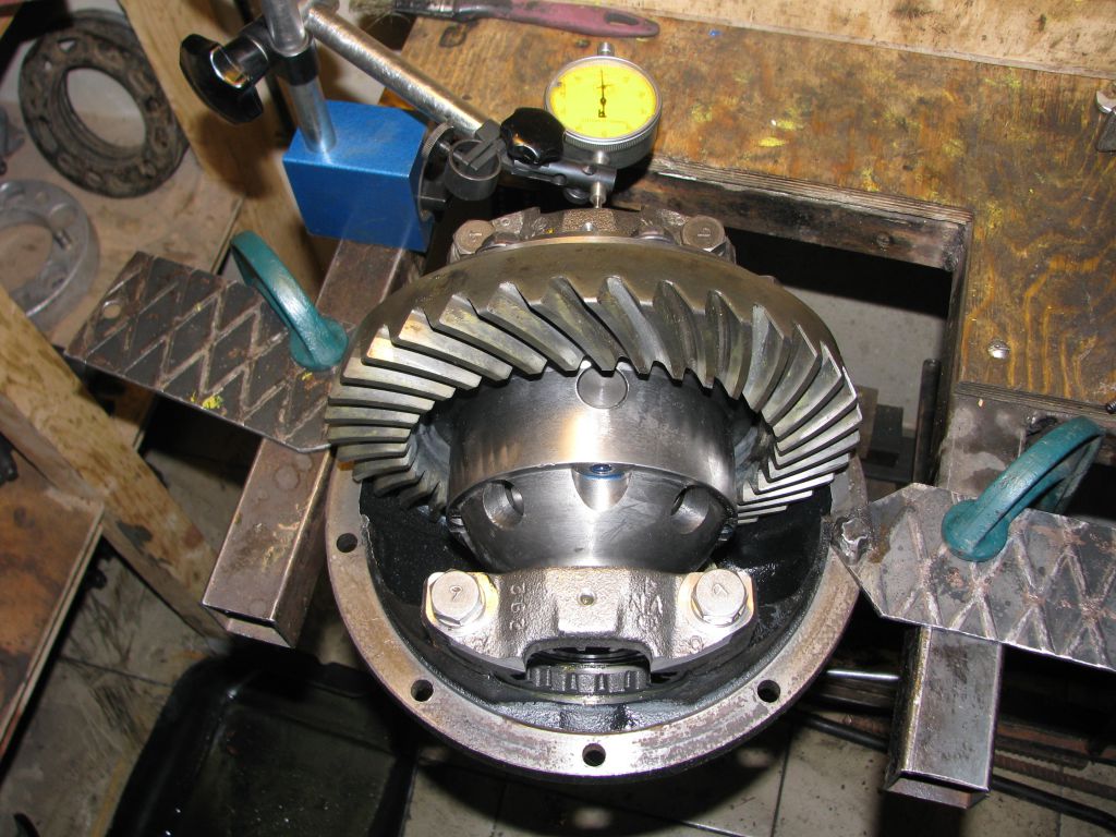 Тяну гайку со стороны шестерни до получения зазора в зацеплении близкого к требуемому. При этом противоположная гайка должна быть отведена. Потом до дури тяну гайку со стороны пиньона. Чередую протяжку с вращением дифференциала и постукиванием молотком по крышкам опорных подшипников дифференциала: подшипники нужно осадить на место. Потом эту гайку ослабляю, пока не пойдет от руки. Ставлю индикатор с упором в противоположную гайку и вновь тяну со стороны пиньона, пока стрелка не пойдет в движение: