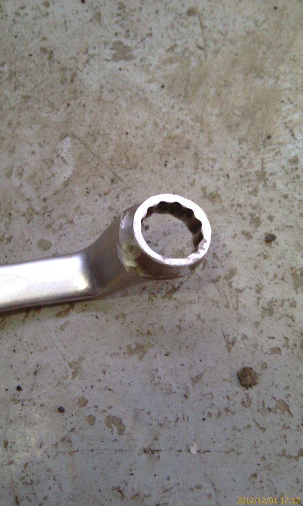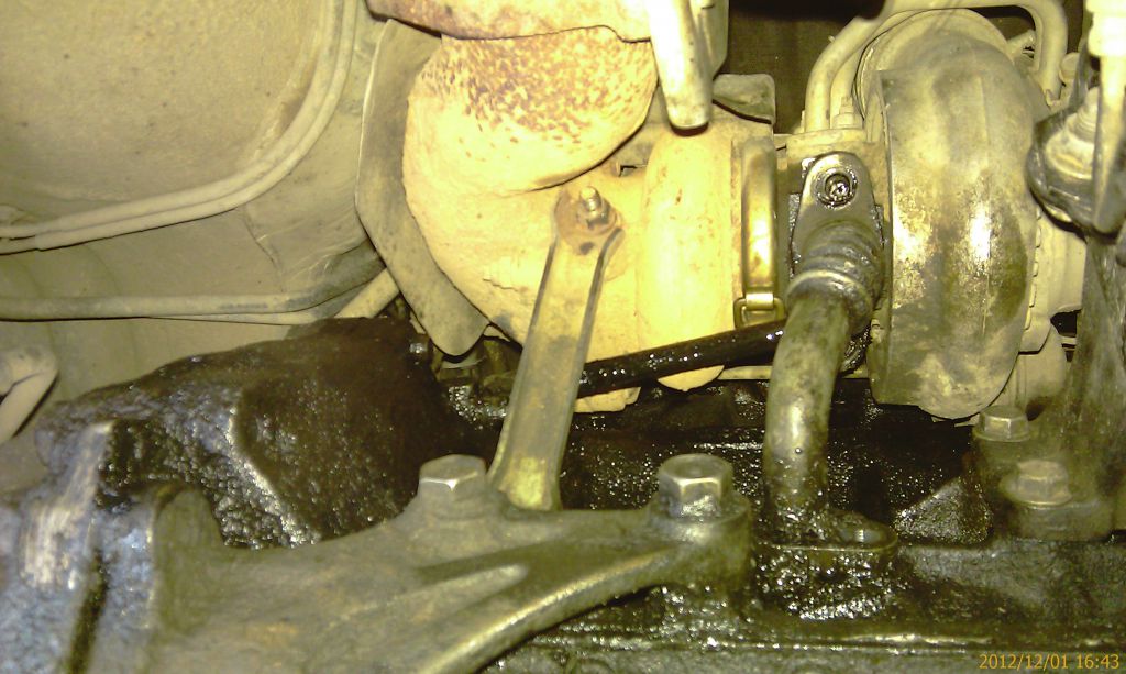 Его крепление на блоке (болт на 12) выкручивается без проблем. С гайкой на 12 на шпильке турбины пришлось помучиться. Также из запасов ключей выбран подходящий комбинированный 12-13 с большими изгибами.