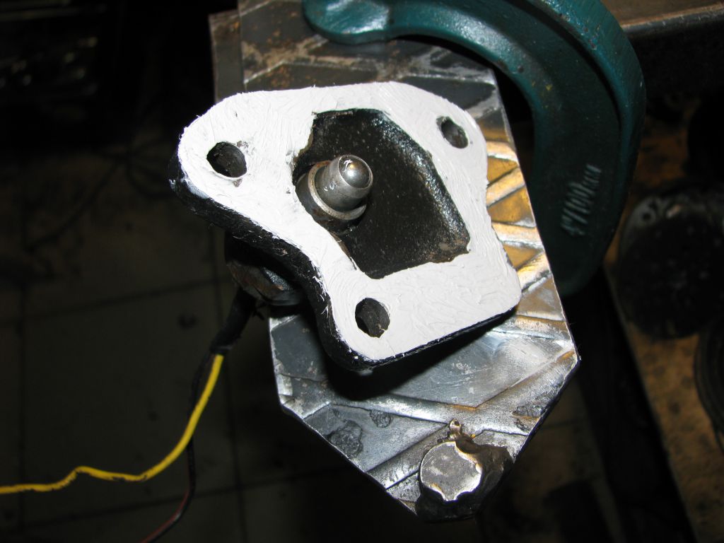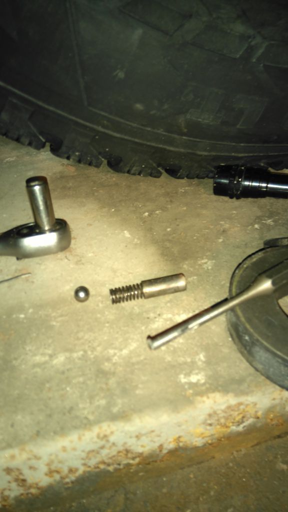 Из-под верхней пробки вынимаются детали фиксатора: пружина, ее обойма и шарик. Глазами этот процесс увидеть невозможно, потому что голова не входит между кузовом и редуктором. Делается вслепую. Обойма сидит в своем гнезде достаточно плотно. Выковыривается самодельным крючком из проволоки. Если снятый редуктор достаточно перевернуть, и шарик выпадет, то на месте его добыть из гнезда весьма затруднительно: переворачивать машину трудновато... Помогает стальной стержень, прилепленный к мощному магниту: