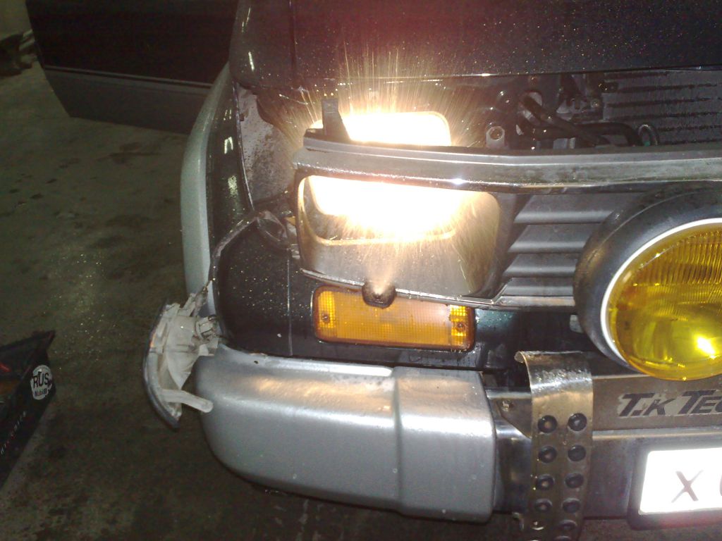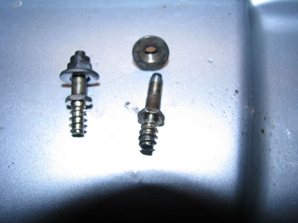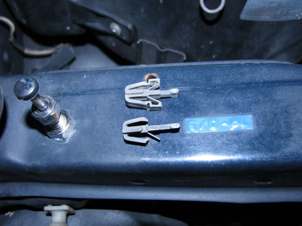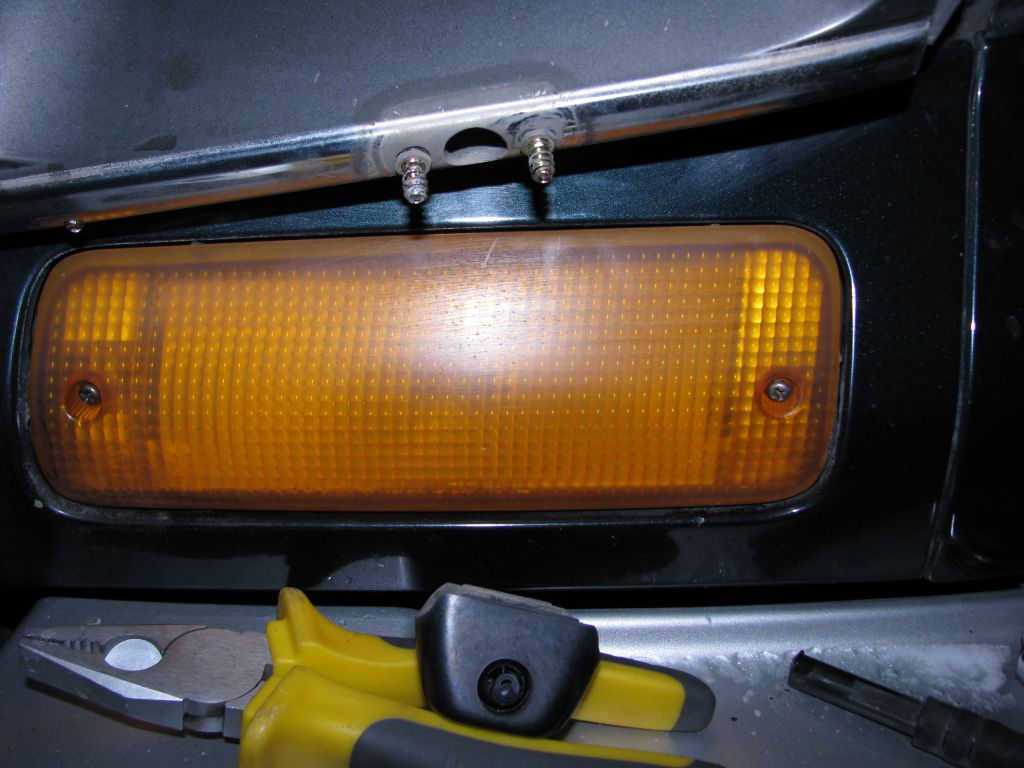 Перед снятием нужно демонтировать габариты, для чего в их верхней части откручивается по одному саморезу, габарит выдвигается вперед и повисает на проводах. Откручивается три самореза в верхней части решетки. Размыкаются семь пистонов защелок, по одному над фарой, по одному внизу за габаритом, три в нижней части решетки. Из семи защелок целых осталось три. Остальные либо сломались при демонтаже, либо уже были сломаны. Вот защелки (целая выше):