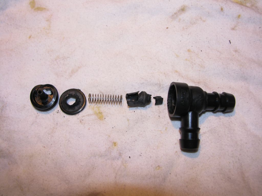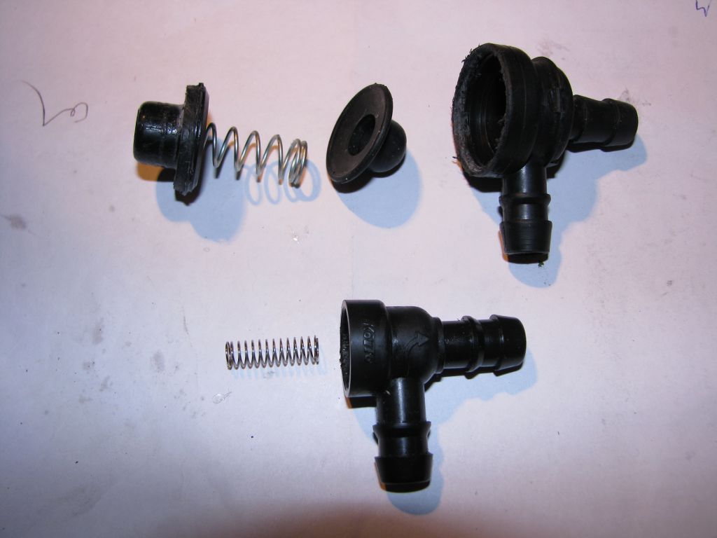 Он абсолютно неремонтопригоден. Основная деталь - резиновый клапан шляпообразной формы. Он рассыпается в руках от старости… Слева и справа от пружины куски этой самой ”шляпы”. Пружина стоит внутри ”шляпы”. Течь через отверстие в клапане однозначно свидетельствует о том, что ”шляпе” кирдык. Омывающей жидкости другого пути к отверстию, кроме как через порванную резинку, нет.