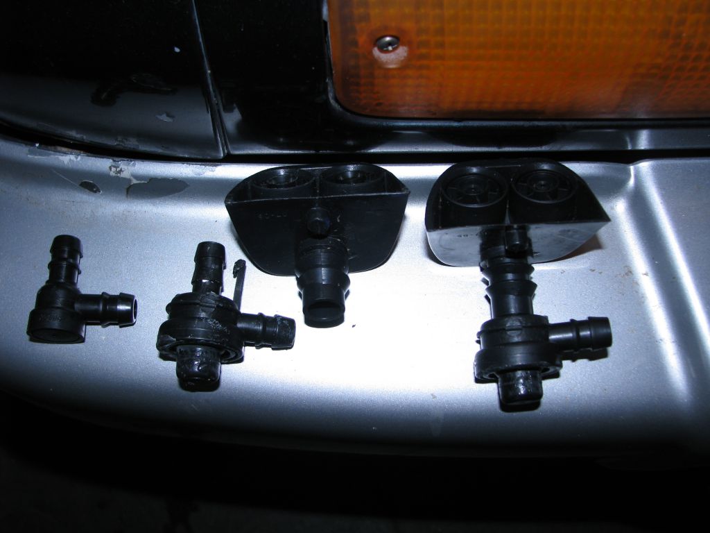 Порывшись в интернете приобрел на тюрьме за 200р. комплект форсунок для омывателя фар высокого давления от ГАЗ-3102. Комплект – это 2 форсунки (в помойку, естественно) и 2 клапана. Клапан защелкнут на форсунку. Правда защелка отваливается уже при первом отщелкивании