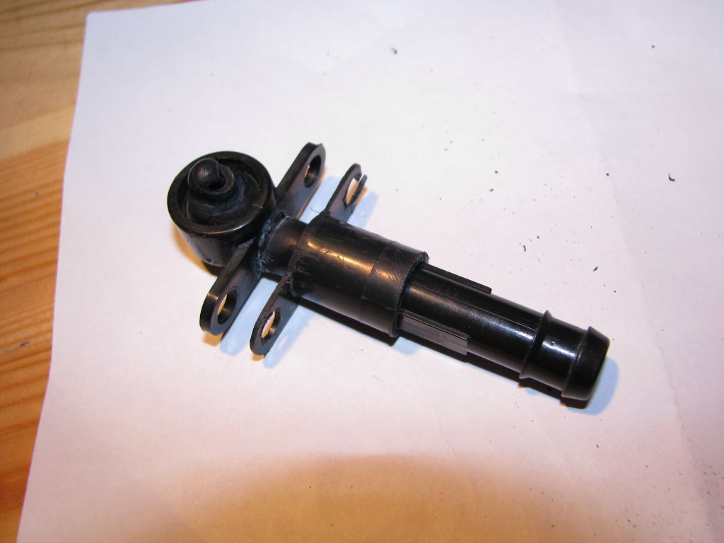 Причина простая – система омывателя Прадеда-78 рассчитана на 2,5атм, а Волговская – на 4,0атм. Многократные перестановки, вплоть до установки одного клапана вместо двух, ни к чему хорошему не привели. Давление в системе в лучшем случае открывает только один клапан. Соответственно, купается только одна фара. При многочисленных перестановках туда-сюда сломал восстановленную форсунку: материал донорской коробки из-под болванок CD  оказался хрупковат…