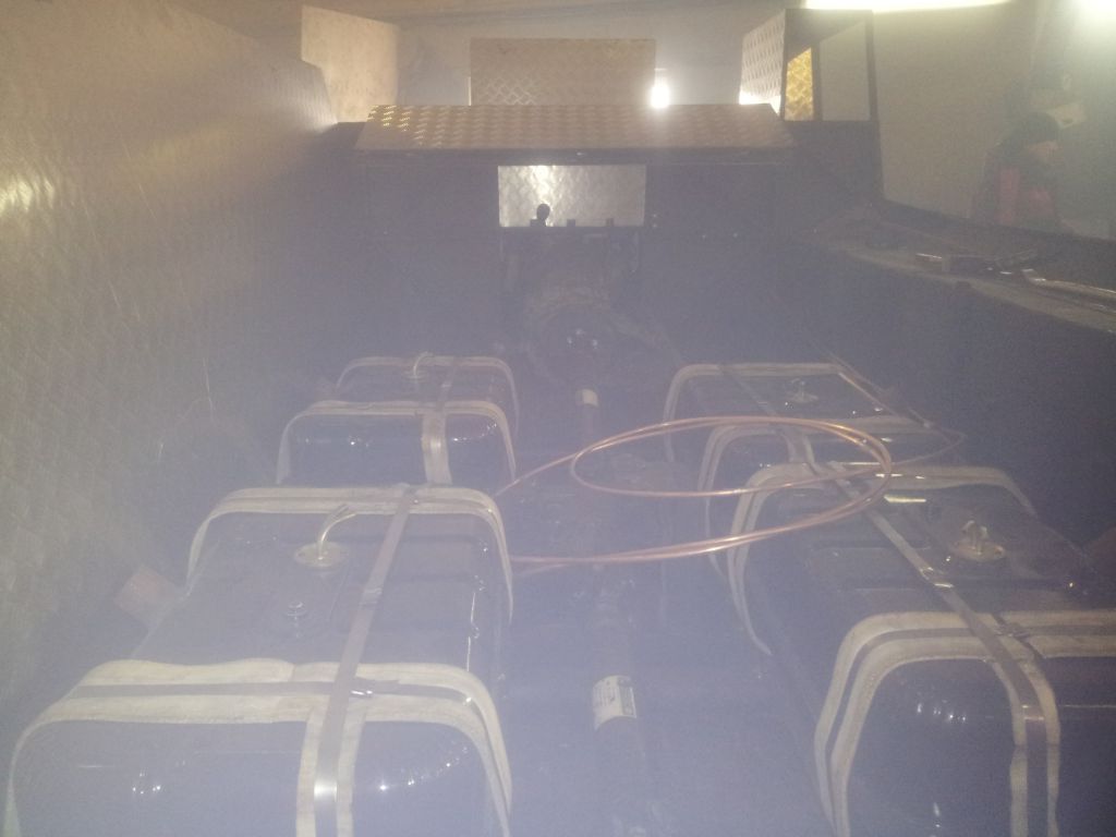 Развернул шестерню в главной передаче из-за смены вращения, между главной передачей и силовым узлом разместил газоновскую раздатку. Время покажет нужна ли будет? Назначение ее не снизить обороты ведущей звезды, а снизить нагрузку на коробку автомат в тяжелые жизненные моменты, как например протаскивание бревна в трясине под брюхом или долгий подъем в крутую гору. Карданы поставил газоновские, один пришлось обрезать и отбалансировать на заводе. Баков установил 4 по 110 литров. итого 440, должно хватить на неделю автономки.