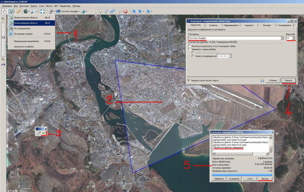 4. Выходит окно "Операция с выделенной областью" Выбираем здесь тип космоснимков и масштаб, который необходимо качать. Жмём "Начать"