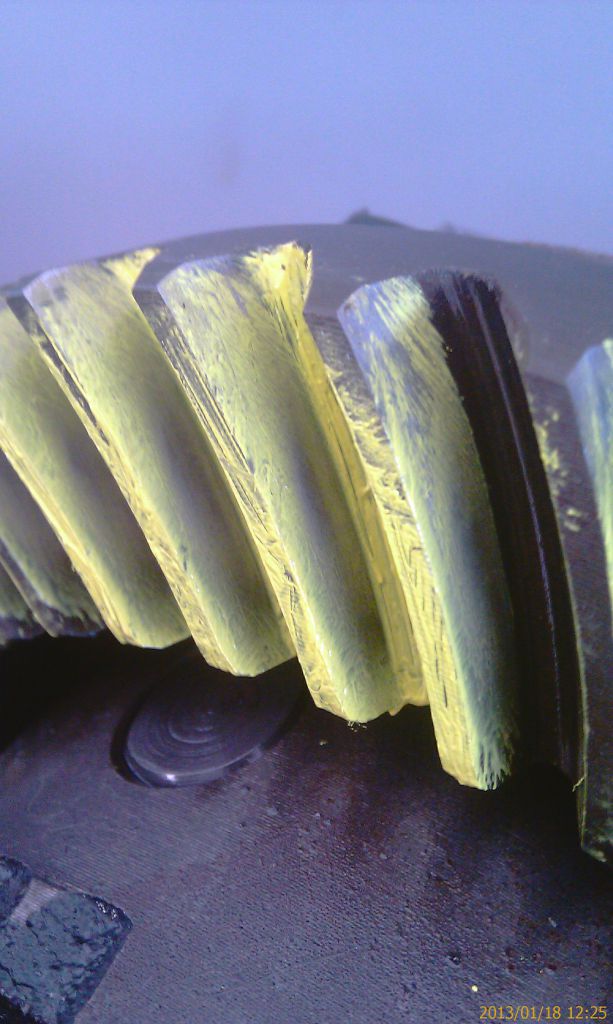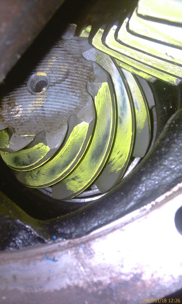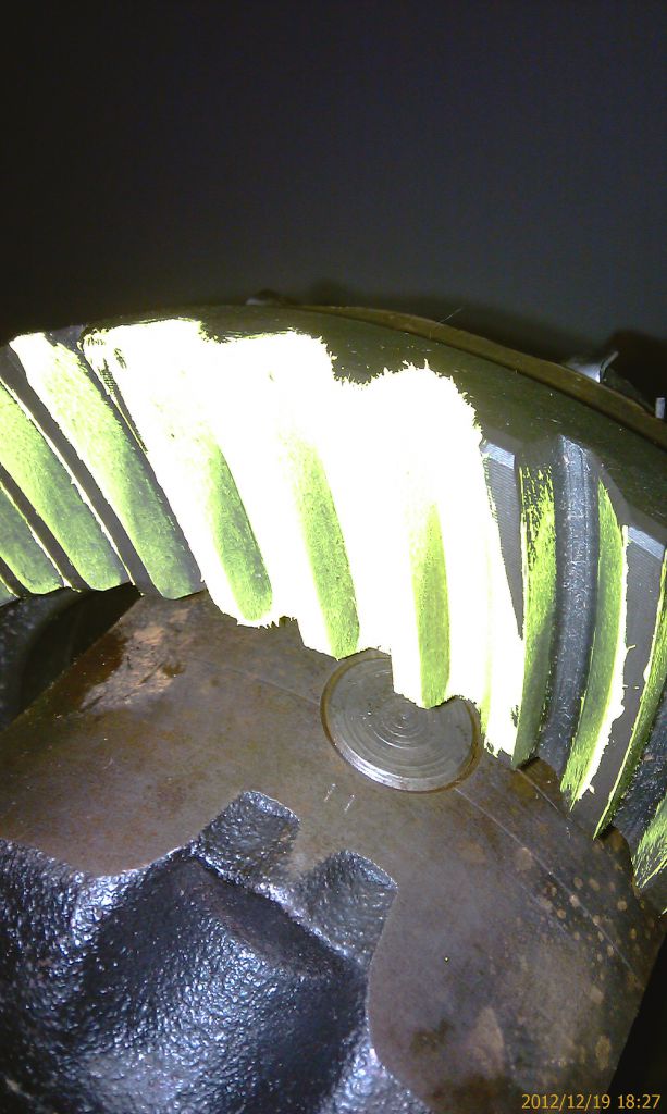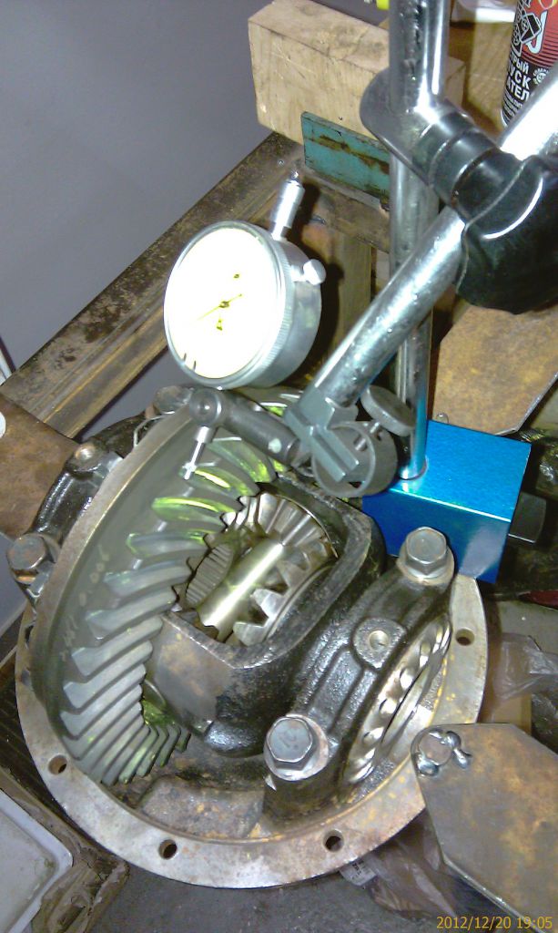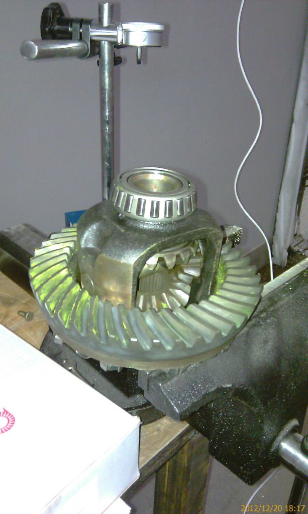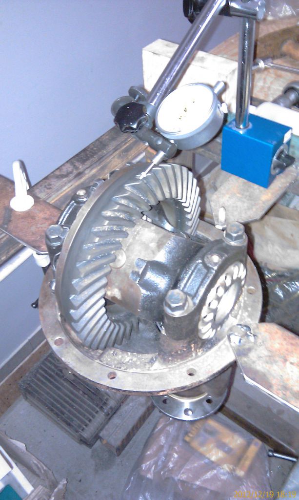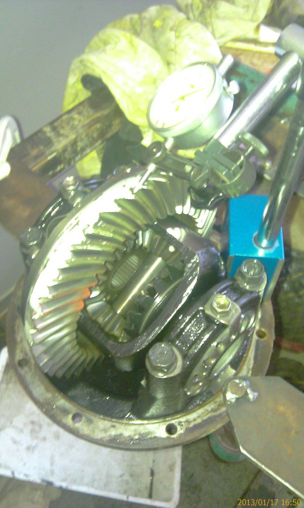 Далее описанная раньше установка дифференциала и регулировка люфта. С люфтом тоже вышла небольшая небольшая засада. Правильный промер делается на каждом третьем зубе. Значения получились от 0,14 до 0,19мм при требуемом 0,13 – 0,18 мм. Т.е. несколько замеров превысили диапазон. Попробовал передвинуть дифференциал к пиньону на одно отверстие. Все замеры уменьшились в среднем на 0,05мм. Т.е. минимальный стал 0,09мм при минимально допустимом 0,13мм. Пришлось вернуть обратно. Пусть лучше будет чуть больше.