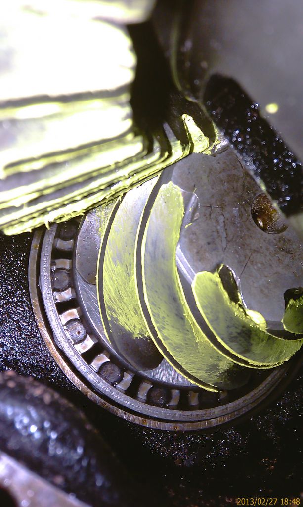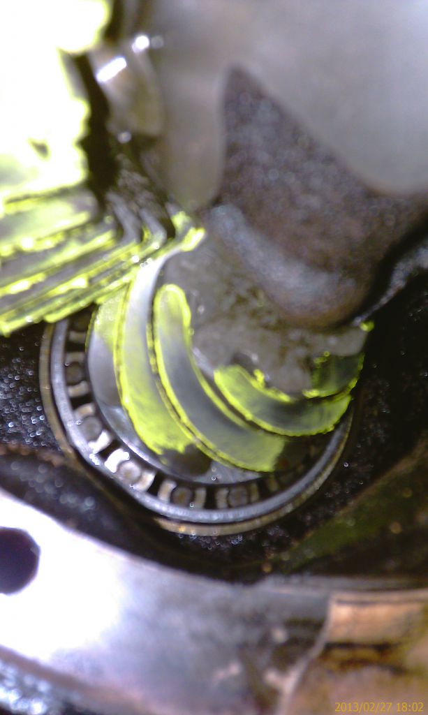Этот редуктор я получил в разобранном состоянии без ГП. Собирал с новой ГП и всеми новыми подшипниками. Перебирая все возможные варианты решил исключить влияние чужого дифференциала. Понятно, что при движении прямо на скорости он не работает. К тому же в масляной среде моста не может появиться такой звук. Но с другой стороны причиной дребезжания могут быть шестерни дифференциала, гуляющие на своей оси, или шлицевые соединения в дифференциале. Все это крайне маловероятно, но все же решил перекинуть NG 4,88 пару в ранее снятый с машины редуктор 4,33. Редуктор разобрал. И вот что увидел на обоих опорных подшипниках: