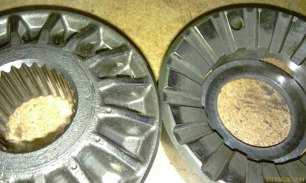 Отверстия под оси разбиты и превратились из круглых в овальные. Оси сточены. Причем с точены они зубьями пиньона, в который они и бьются при работе. Пиньон в кадр не попал, но его зубья также аккуратно срезаны в верхней части.