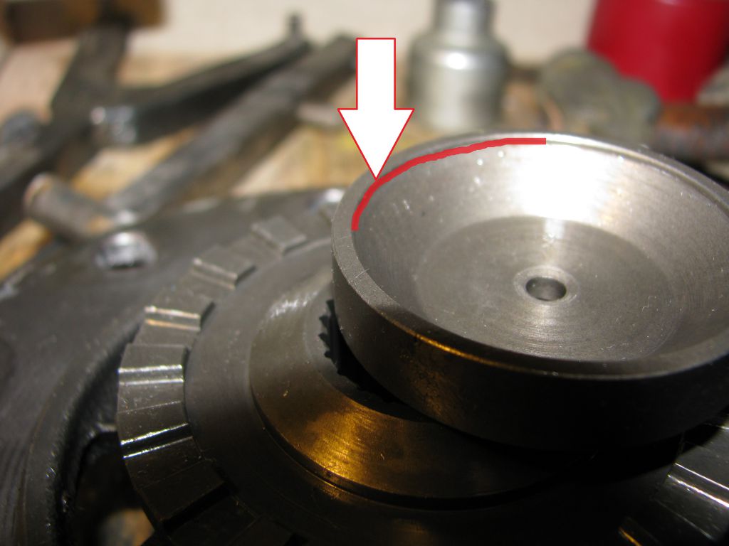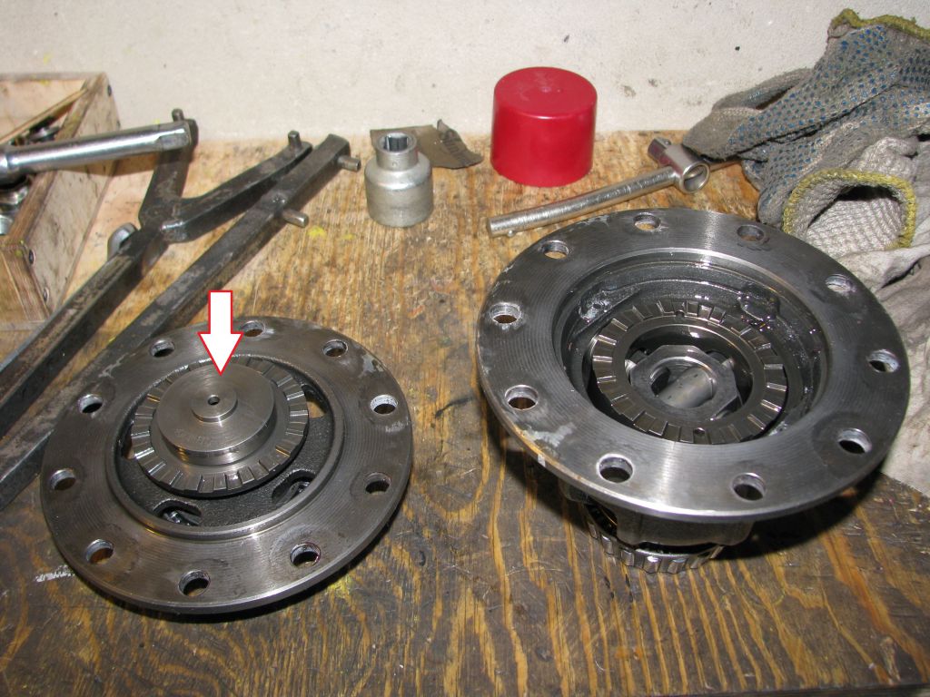 Снять его удалось только выколоткой. Это тот самый спайсер, с которым при сборке были проблемы: недостаточный зазор, с его стороны сайдгир был установлен без шайб. А произошло вот что. Спайсер не садится на посадочный буртик сайдгира: