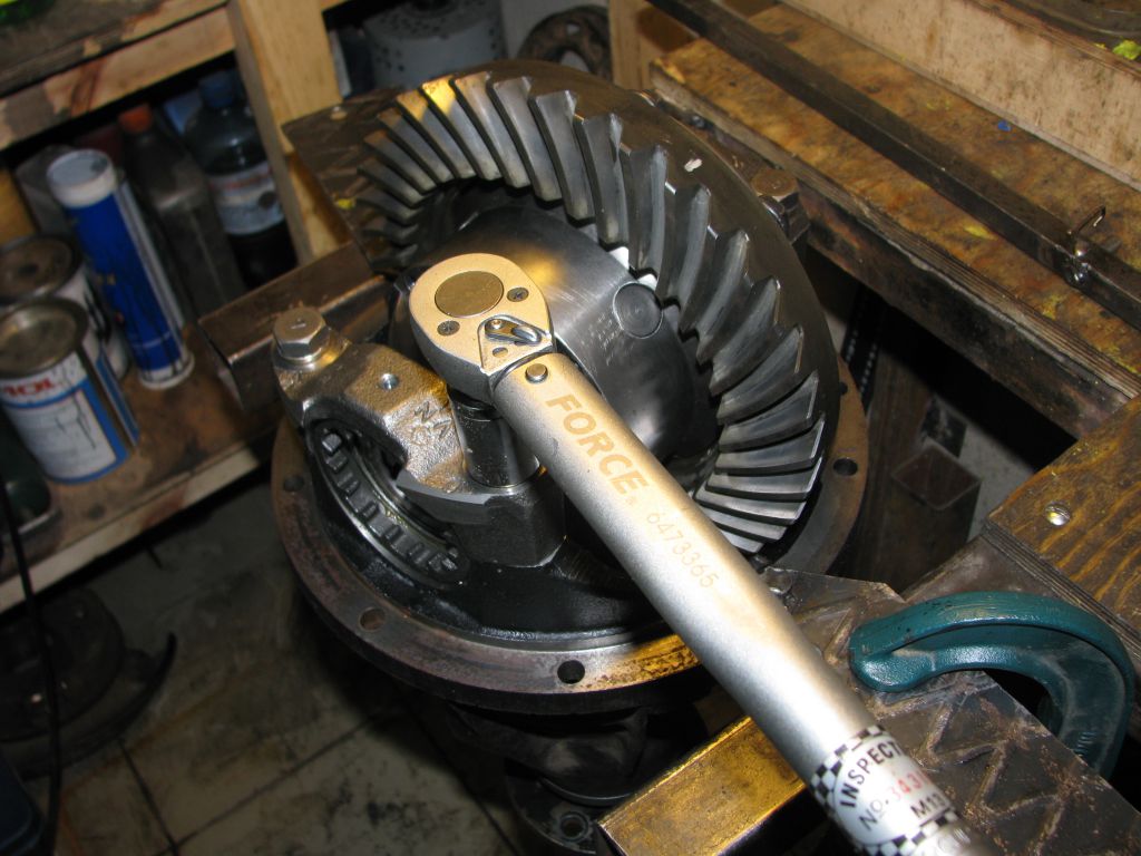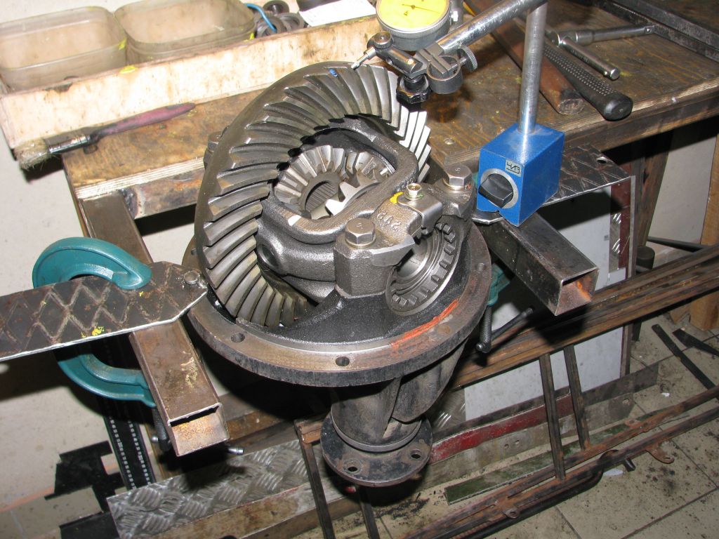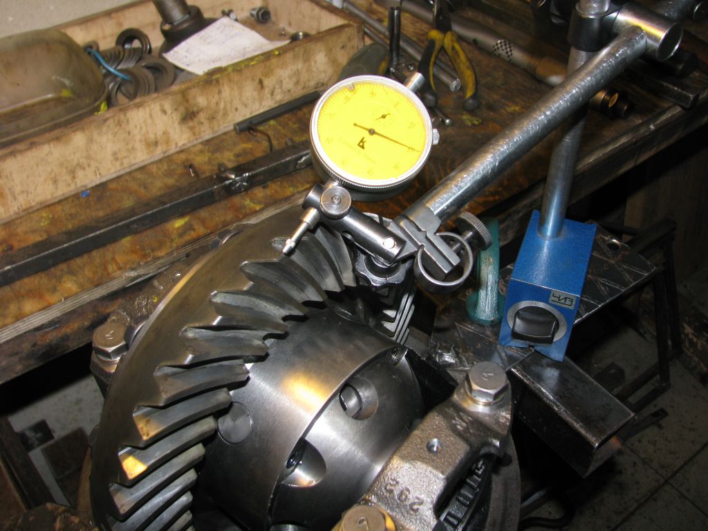 Тяну гайку со стороны шестерни до получения зазора в зацеплении близкого к требуемому. При этом противоположная гайка должна быть отведена. Потом до дури тяну гайку со стороны пиньона. Чередую протяжку с вращением дифференциала и постукиванием молотком по крышкам опорных подшипников дифференциала: подшипники нужно осадить на место. Потом эту гайку ослабляю, пока не пойдет от руки. Ставлю индикатор с упором в противоположную гайку и вновь тяну со стороны пиньона, пока стрелка не пойдет в движение: