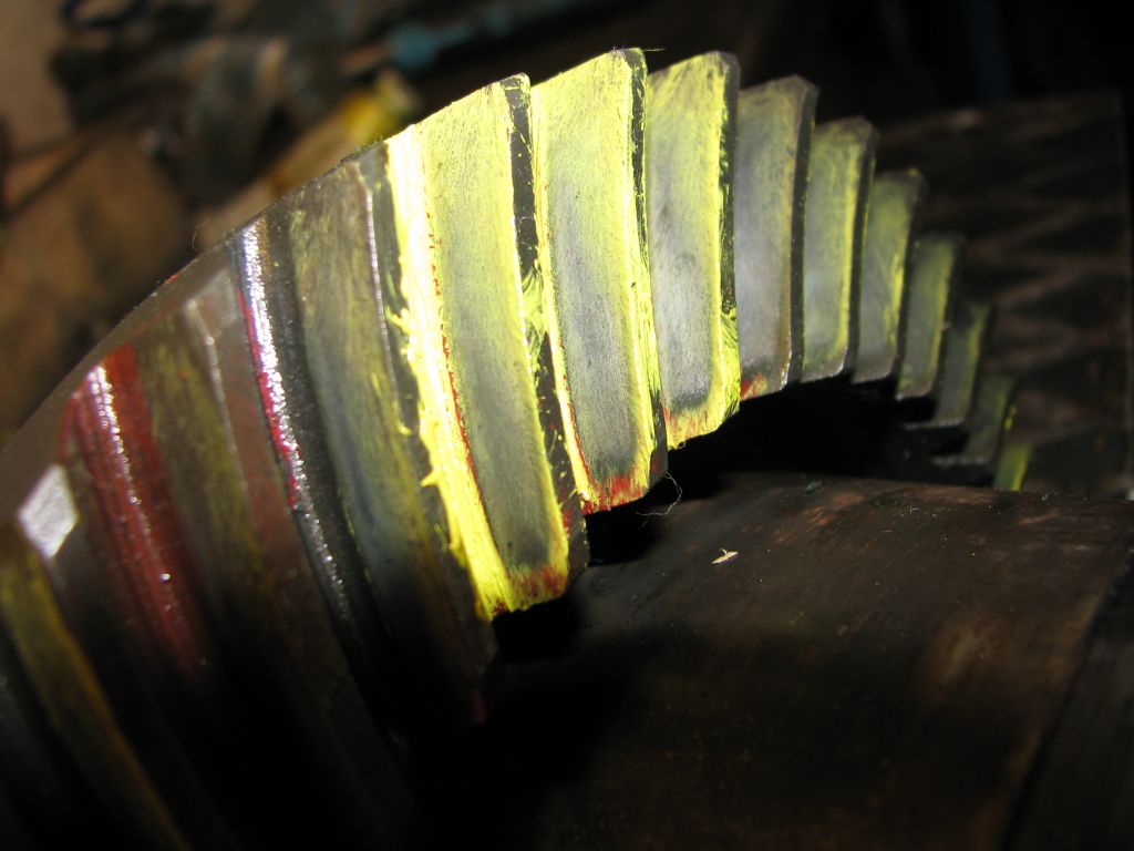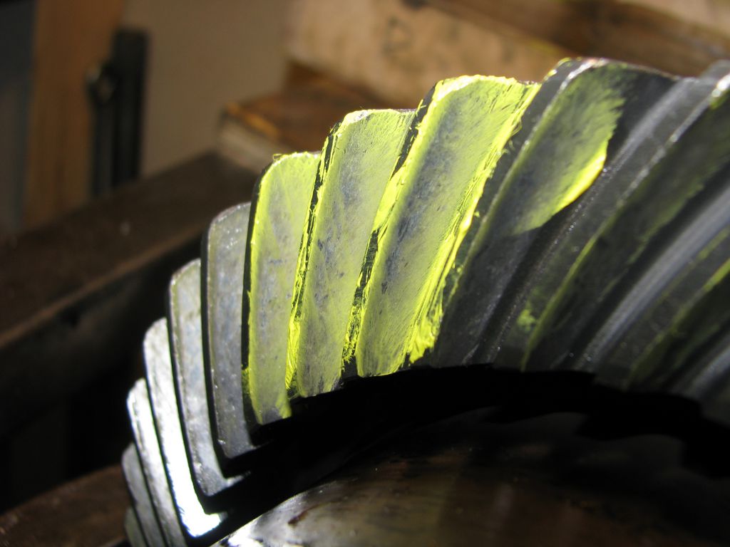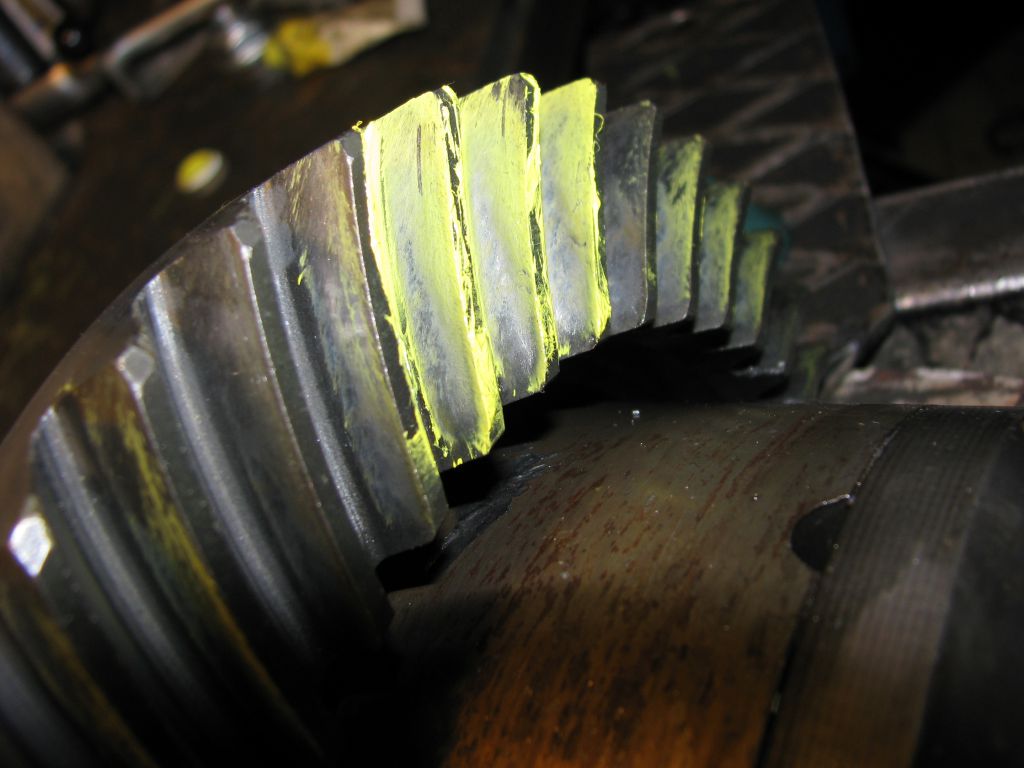 Собираю и заново регулирую со старой парой. Она тоже слегка побита и есть незначительные забоины. Надеюсь, что прикатаются. И надеюсь, что не появились трещины на зубьях. Пятно стало похуже, чем было: