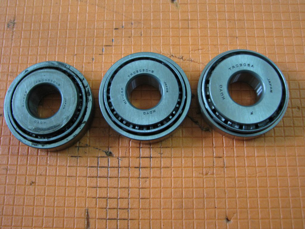 Пришлось ехать в Автоград. За два часа поставил на уши всех, нашел три подшипника KOYO TR0305C-9, полностью аналогичных снятым. По 360 рублей, 16 роликов. В другом месте нашел KOYO TR0305А по 550 рублей, 15 роликов. В итоге пришлось взять пару одних, пару других. При этом Автотрейд предлагает, типа, оригинал, где в фирменных коробках лежат KOYO TR0330 по 650 рублей. Вот подшипники слева направо (родной, такой же, как родной, почти как родной):