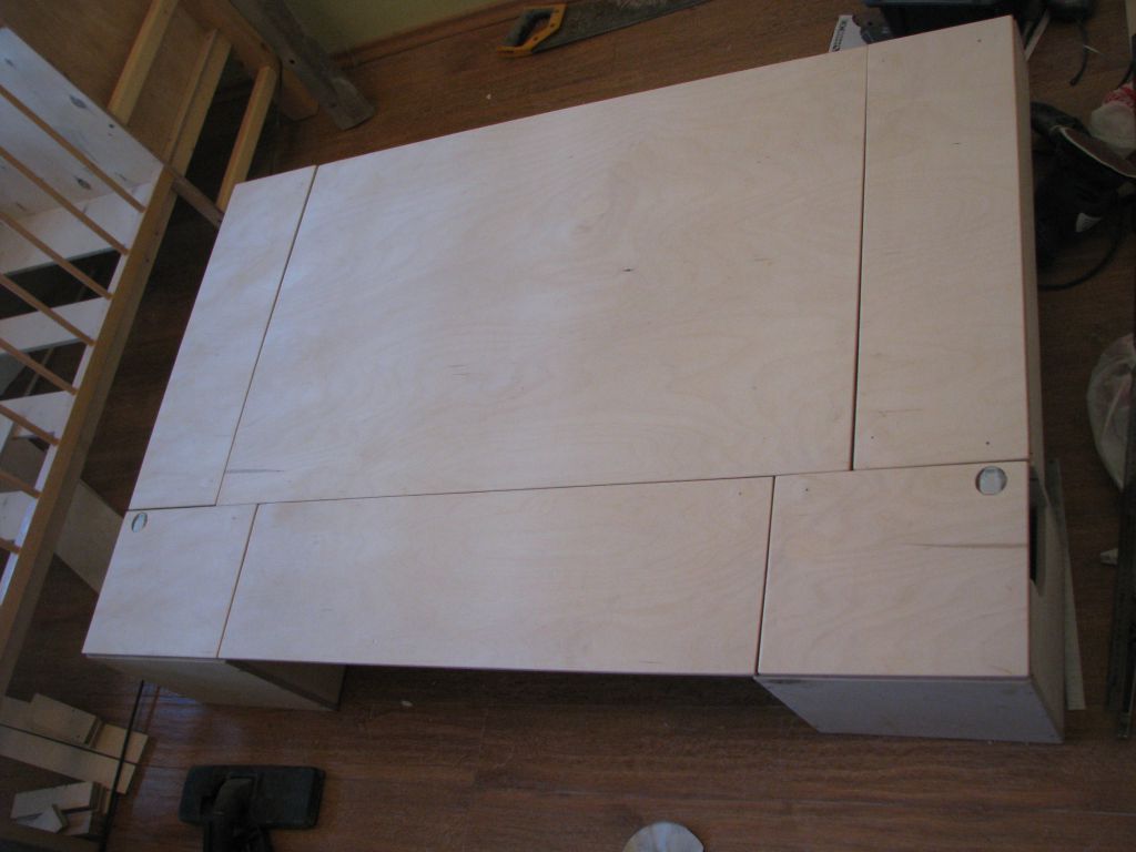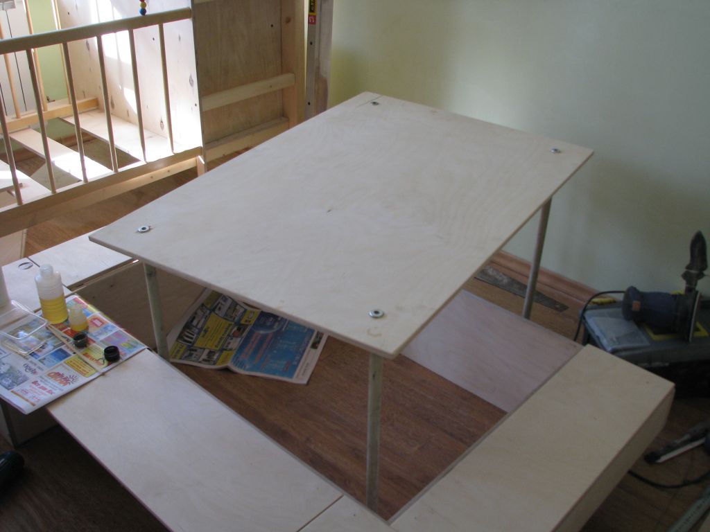 А вот так средняя часть крышки легким движением превращается в стол (на заднем плане уже почти достроенная двухъярусная койка для моих девчонок :) ):