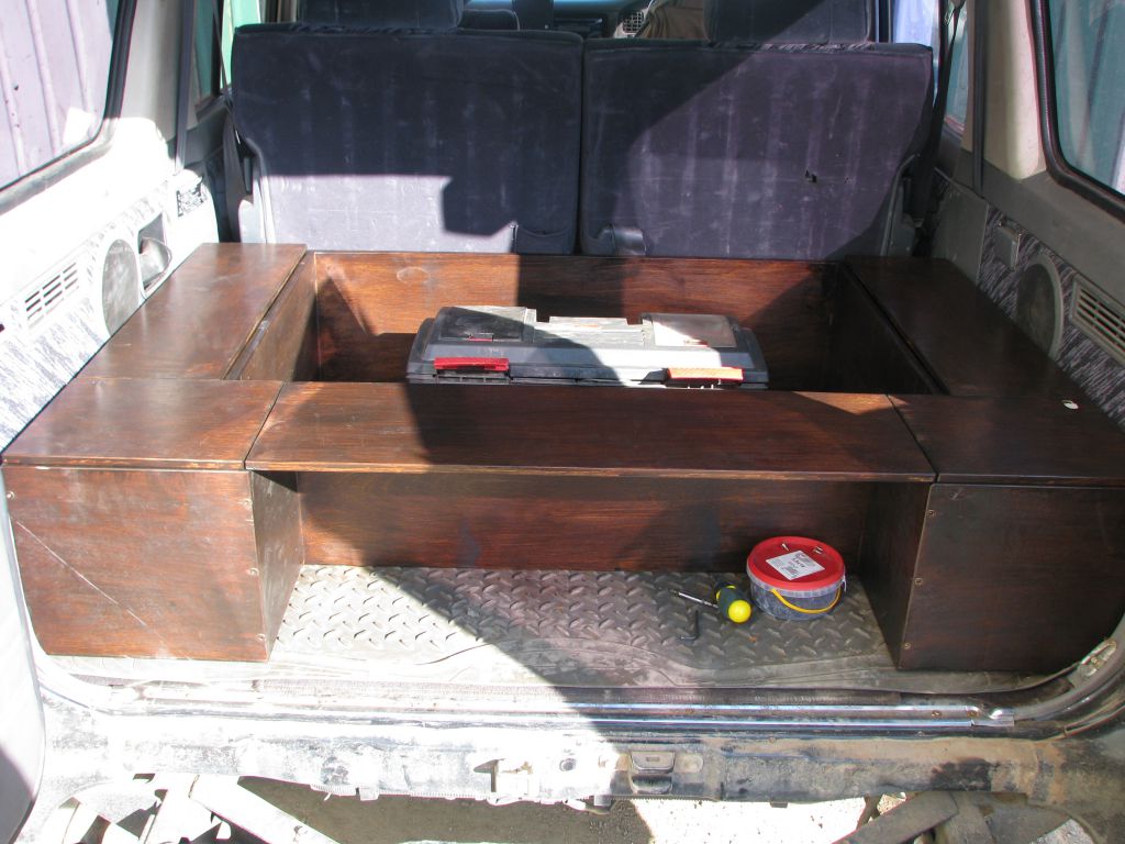 При примерке конструкция встала как влитая. Полагаю, что крепление не потребуется. к тому же задние боковые ящики с дном. В них будут в основном баклашки с жидкостями. Так что они еще придавят. Если окажется не достаточно, то закреплюсь кронштейнами за крепеж третьего ряда сидений. Я его даже на всякий случай зафотал и промерил :dirol: .