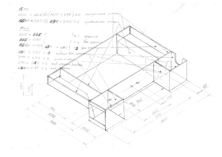 Потом вычертил багажник, набросал конструкцию и раскрой. Основа сооружения из фанеры 15 мм, остальное из 12 мм:
